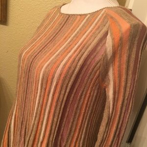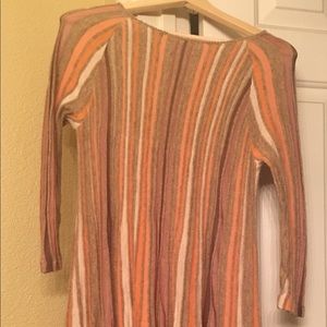 Anthropologie Moth Stripe Midi Dress in several colors of tan, cream, orange, pinks, burgundy, Midi length approx 38" long, 3/4 sleeve, and separate full light pink liner INCLUDED. Dress has snap on inside shoulders, to secure liner. Nice light sweater dress with Hi-Low hemline Tags says XS but this can fit a size Small too (it's anthro sizing that runs a little big)