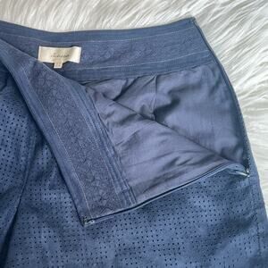 Square perforations five a lightness to these flowy navy shorts from Anthro. The fabric is soft and coated almost like a faux suede. Fully lined.