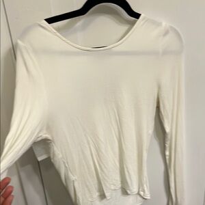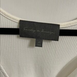 This chic blouse from Sunday in Brooklyn features a striking asymmetrical design with ruffled details, crafted in a soft white fabric. The long sleeves and deep V-neckline add a touch of elegance, making it a versatile piece for both casual and dressy occasions. Its form-fitting silhouette ensures a flattering fit, perfect for a fashion-forward look. Great used condition