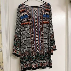 A1116. In the notable colors of this brand, this tunic/dress is bright and sassy in a patchwork of ETHNIC patterns. It has a scooped V-neck and long bell sleeves. Upscale BOHO. Add leggings or boots or a great floppy hat and it will state your style!