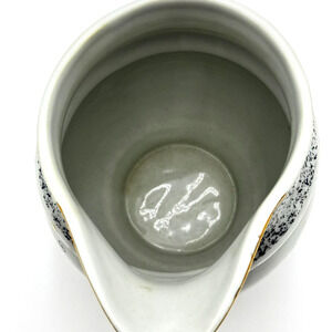 ANTHROPOLOGIE Fancy White Blue 21k Gold trim elegant vintage style pitcher, showcasing a blend of classic design and artistic flair. The piece features a pristine white body adorned with delicate blue floral patterns, complemented by shimmering gold accents on the handle and spout. The upper portion of the pitcher boasts a unique speckled design, adding a touch of modern sophistication to the overall aesthetic. Perfect for serving beverages at a formal dinner party or as a decorative accent in a vintage-inspired kitchen, this pitcher brings a touch of timeless charm to any setting.
