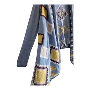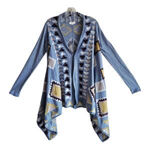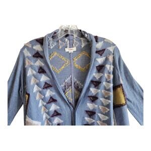 ANTHROPOLOGIE Fiets Voor 2 Women's Size XS Cardigan Sweater - Open Front, Aztec Pattern, Blue, Yellow, Burgundy, Fitted Arms, 44% Cotton, 33% Wool, 23% Acrylic