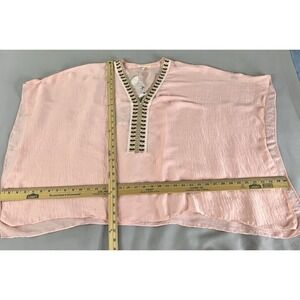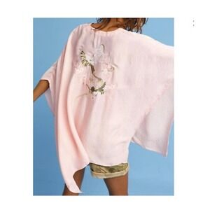 The product is an Anthropologie Floreat Bohemian Pink Peach Embroidered Poncho in one size. This stylish and versatile poncho is designed for women who love a bohemian look. The pink color and embroidered accents add a touch of boho flair to any outfit. Perfect for a casual day out or a more dressed-up occasion, this poncho is a must-have for any fashion-forward woman.
