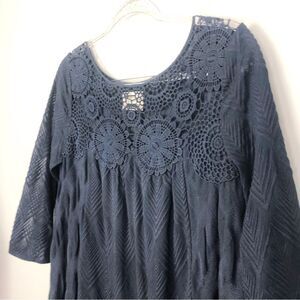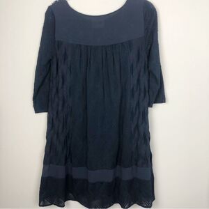Beautiful dark blue 3/4 length long sleeve dress by Holding Horses for Anthropologie. Tunic style with crochet lace and sheer detailing. Lined. Slight high low hem. Great condition. Womens size extra small (XSmall, x-small).