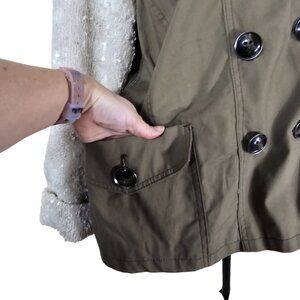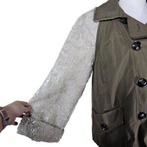 Sequin jacket, olive green jacket, women's double-breasted coat, Anthropologie jacket, chic women's coat, casual glam jacket, sequin sleeve jacket, Hei Hei coat, olive green sequin coat, cotton polyester jacket, women's L jacket, stylish women's outerwear, women's fashionable coat, safari, sparkly, gorpcore, outdoor, preppy, army, utility, cargo, swing coat, glamorous