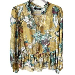 ANTHROPOLOGIE Hemant & Nandita Keysyone Blouse in Green Floral 100% Silk M