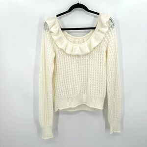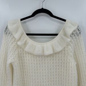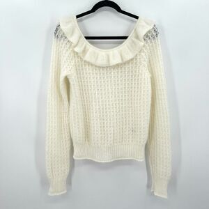ANTHROPOLOGIE Ivory White Ruffled Boat Neck Soft Wool Knit Sweater Size Medium