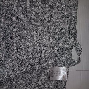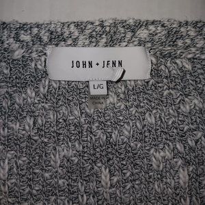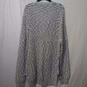 Size Large - Women's John + Jenn an Anthropologie brand long sleeve pullover v-neck sweater has side slits in a gray, white, and black marbled color. The material is 80% cotton and 20% acrylic in gently used preowned condition