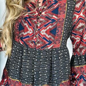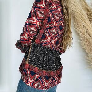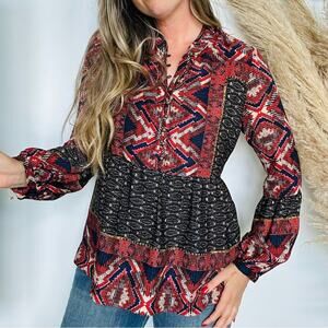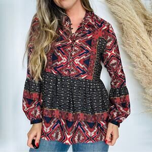 ANTHROPOLOGIE JOSEPH KONRAD Zydeco Red Black Peasant Silky Blouse Tunic Top M