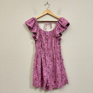ANTHROPOLOGIE KOPAL Myra Romper Ruffles Floral Purple Red Motif Sz L Vacay Beach W9972