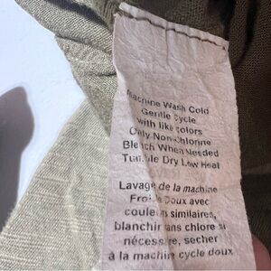 Elevate your style with this Anthropologie Left of Center tunic top. The olive green, solid cotton and rayon knit fabric is accented with pleats, ruffles, and buttons. The relaxed fit and scoop neck make it perfect for a casual occasion, while the hi-lo hem and roll tab sleeves add a touch of elegance. This bohemian-themed blouse is perfect for all seasons and is machine washable. The pullover closure and button back detail add convenience to style. This size medium top is perfect for women who want to add a unique touch to their wardrobe.