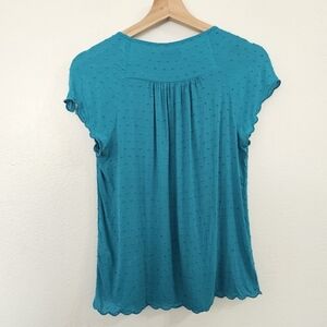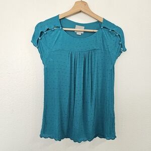Maeve for Anthropologie. Blue Swiss dot short sleeve blouse with buttoned shoulders. Scalloped hem and sleeves. Size 0. EUC.