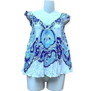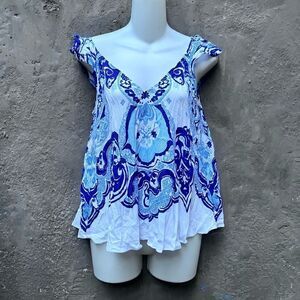 ANTHROPOLOGIE MAEVE CLANA FLUTTER CAP SLEEVE PAISLEY PRINT TRAPEZE TOP BLUE SZ 4