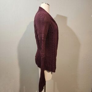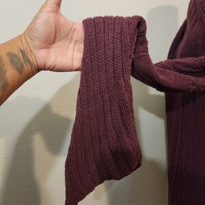 Unique and rare Anthropologie Moth open knit cardigan in a rich burgundy hue. Features a striking cable knit “skeleton spine” design down the back for an edgy, gothic-inspired touch. Open front, cozy knit, and relaxed fit make it the perfect layering piece for fall and winter. A standout statement sweater that blends boho, grunge, and artsy vibes
