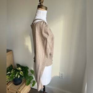 Tan cardigan from Anthropologie Moth brand. A take on the cold shoulder with this strappy shoulder cut out. Also a bit of a puff sleeve with gathered material on top of the shoulder. Size tag missing but would place this as a small based on fit. Soft knit cotton blend.