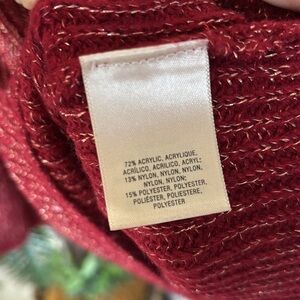 Stunning maroon knit sweater with gold lurex threading from Anthropologie's Moth, size small. This chic piece pairs beautifully with black leggings or ankle pants along with booties. It showcases a crew neck and long raglan sleeves, where ties at the cuff create elegant bell sleeves. Crafted from an acrylic blend, it's machine washable.
