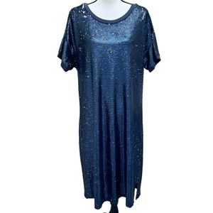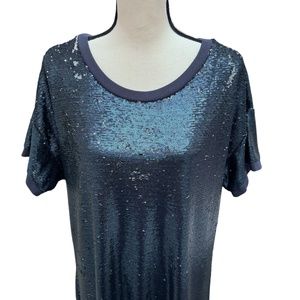 Anthropologie navy blue sequin Moulinette Soeurs Interstellar tunic shift dress. There are 2 areas missing sequins on each sleeve. See photos. Never worn. In very good condition.