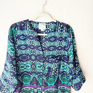 DETAILS: Anthropologie size small. Maeve label, frequencies style, ikat southwestern print, button front style, unlined. Polyester, dry clean.