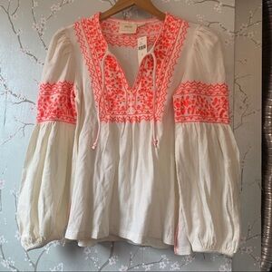 Intricate embroidery in juicy coral hues lend this boho inspired blouse a captivating finish
