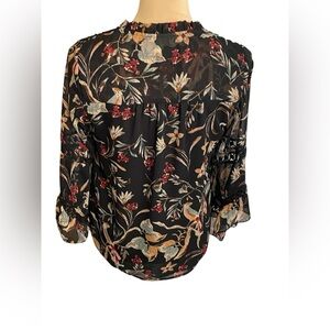 Elegant sheer blouse with a floral pattern. Black base with red and tan flowers. Ideal for any occasion.