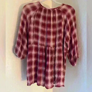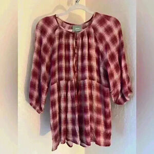 ANTHROPOLOGIE | Maeve Pink Plaid Peplum Boho Peasant Tunic Blouse | Medium