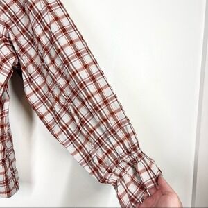 Maeve by Anthropologie plaid-print buttondown shirt. Ready to see you through the changing seasons, it's crafted from a breezy cotton-blend yarn woven with a hint of stretch and trimmed with waves of playful ruffles around the wide collar and cuffs of the long sleeves. •pit to pit: 25” •length: 26” •condition: excellent pre-owned tags ➵ boho, slouchy, oversized, edgy, distressed, grunge, hippie, old school, retro, nwt, y2k, 90s, tiktok trend, blogger favorite, modern, festival, streetwear, academia goth grannycore pastel prairie goblincore