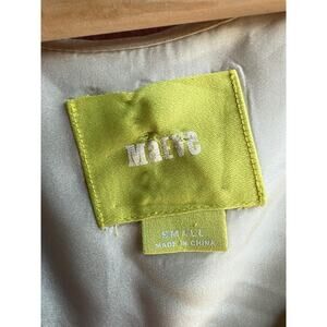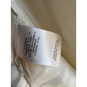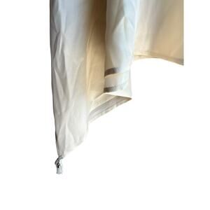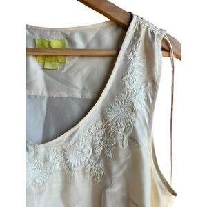 Elevate your wardrobe with this stunning Maeve Silk Embroidered Afterglow Peasant Top Blouse. This beautiful ivory-colored top features a V-neckline, asymmetric hem, and sleeveless design. The small slits under each side with tassels and the embroidered accents add exquisite detailing to the chiffon fabric. Perfect for any occasion, from party/cocktail to casual or business, this flowy-fit top is a versatile addition to your wardrobe. Dry clean only to maintain its quality. This top is labeled as a size small and is perfect for regular-sized women. Get ready to rock this stylish peasant top and add a touch of elegance to your outfit.