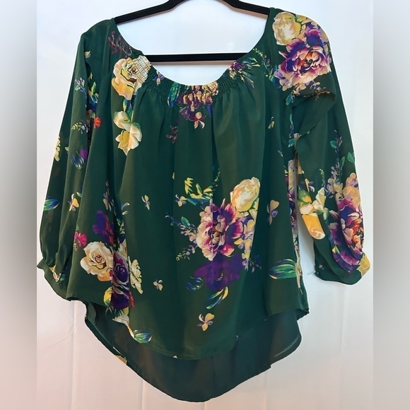 ANTHROPOLOGIE (Maeve) Tallie Green Floral Open-Shoulder Silk Top- Size X-small