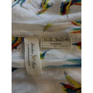 The Anthropologie Meadow Rue Multi-Color Bird Tie Front Peplum T-Shirt Tee Top in XL is a stylish and comfortable top perfect for casual occasions. It features a unique bird print pattern in white, short sleeves, and a round neckline with a pullover closure. Made from 100% cotton knit fabric, this top is machine washable and lightweight, making it ideal for all seasons. The peplum design adds a trendy touch, while the breathable material ensures comfort. Perfect for women who love nature-inspired themes, this top is a versatile addition to any wardrobe.
