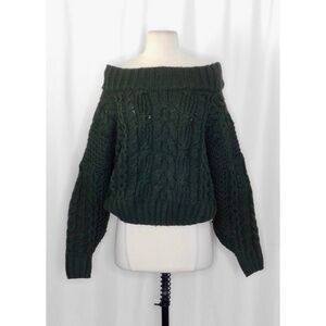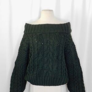 Wide rounded neckline … can be worn off one shoulder if desired ~ Long sleeves with dropped shoulder seams ~ Straight hemline ~ Slouchy fit ~ Pullover styling … no closures ~ Soft unlined knit fabric ~ Knit is a mixture of cable knit patterns/designs ~ Solid dark green color