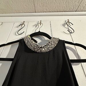 Elegant black dress featuring a stunning embellished collar. Perfect for special occasions. New with tags size small. Missing one stone in the back by button. Not noticeable at all.