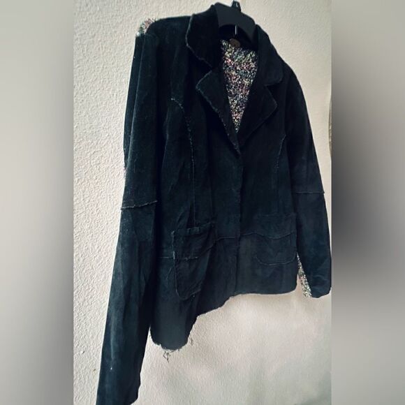 BLACK EXPOSED SEAM VELVET FEEL JACKET WITH MULTICOLORED KNIT SWEATER BACK