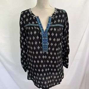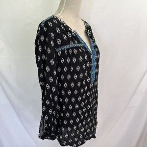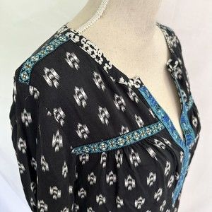 ANTHROPOLOGIE ONE SEPTEMBER Folia Split Neck Embroidered Peasant Henley Blouse. Boho Mixed Fabric Design with Brocade Trim. Long Sleeves can be rolled up with attached tab. Hi Low Hemline. EUC