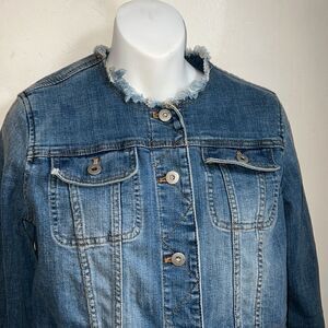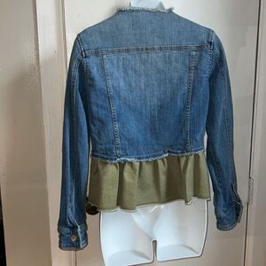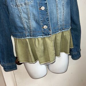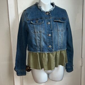 Washable cotton and spandex blend denim jacket with olive green cotton, polyester, rayon, spandex blend ruffle, raw hems, button closure, button chest love, pockets and cuffs. Excellent condition. Size XS, measures 18” from armpit to armpit and 21” from top of shoulder to bottom hem.