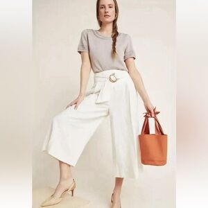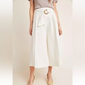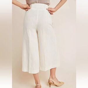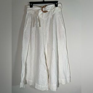 ANTHROPOLOGIE Palm Beach Belted Pants Wide Leg Crop Linen Cream Tan Stripe Sz 0