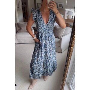ANTHROPOLOGIE Peregrine Midi Dress in Blue Floral Motif Size Small