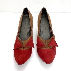 Anthropologie Pilcro & the Letterpress Paper Color Block Suede Closed Toe Pumps Heels in Beige with Red