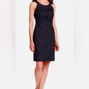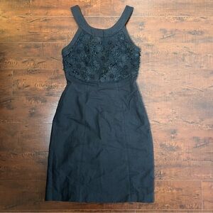 Sleeveless with an empire waist and floral appliqué bodice. Side zip closure, lined. Excellent pre-owned condition, no flaws.