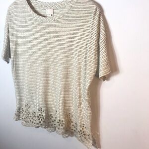 Striped knubbed short sleeve scoop neck shirt with embroidered lace scalloped hem & side vent in ivory / black color.