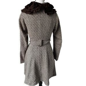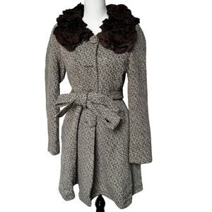 Beautiful unique coat for fall winter holidays. It's warm and has a silky lining. Brown and white with buttons down the front and a belted waist. It has pockets. It is flattering and cute. Perfect to complete that sweet boho cottagecore flirty look. Why look like everyone else when you can stand out with a unique piece like this?