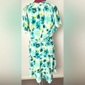 Chic mini dress with teal floral pattern. Features a relaxed fit and flutter sleeves. Ideal for casual outings.