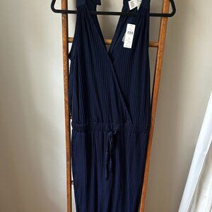 A chic navy jumpsuit from Saturday/Sunday by Anthropologie, designed with soft pleats, a silky back panel, and a flattering surplice neckline. Features a drawstring waist, tapered legs, and an easy pull-on fit. Excellent condition.