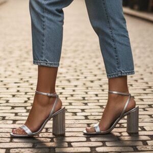 A Glimmer for the Modern Muse..They're minimalist yet impactful, grounding the ethereal silver finish in sleek, contemporary design with a nod to classic glamour. The true pièce de résistance? ...A subtly curved, architectural block scalloped heel adds a delightful, unexpected texture and provides both drama and stability. These sandals are all about making a statement and are ready to make moves wherever you go. They feature a slender toe strap and a sturdy block heel with a design twist and offer a just-right height for effortless wear.