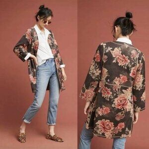 ANTHROPOLOGIE SOLITAIRE Faux Suede Floral Jacket Kimono Open Front Cardigan Sz M