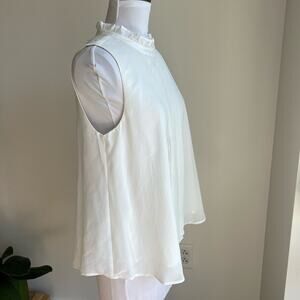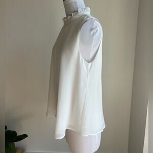 Sleeveless blouse with pleats and ruffle neckline.
