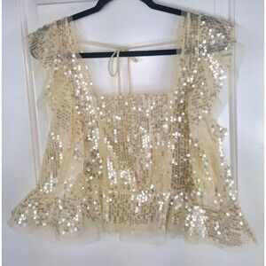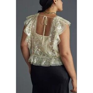 Elevate your wardrobe with this stunning Anthropologie sequin ruffled tank top. The square neckline and flutter sleeves add a touch of bohemian charm, while the pullover closure ensures a comfortable fit. This lightweight and breathable top is perfect for any occasion, from travel to party/cocktail or casual events.The ivory color and classic style make this tank top versatile and easy to pair with any outfit.