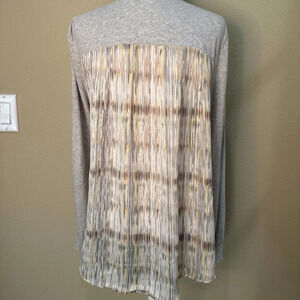 Front is a classic grey cardigan, back is almost sheer striped chiffon. Elevated style.