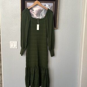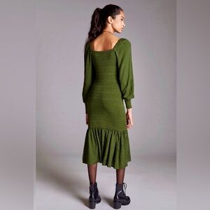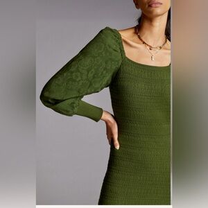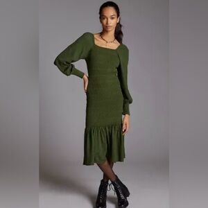 🆕 ANTHROPOLOGIE Smocked Puffy-Sleeved Midi Dress Dark Moss Green S