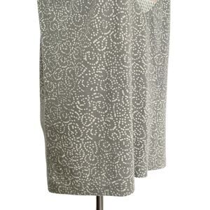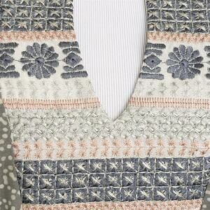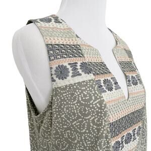 Gorgeously embroidered and very soft floral tank top with metallic threads subtly woven in. Base color is gray with a slightly sage-green tinge to it. Notched V-neck. Loose fitting and would likely work for a Size S, maybe even M.
