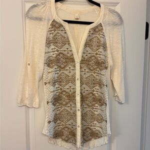 ANTHROPOLOGIE TINY Silk Metallic Silver & Gold Embroidered Henley Tee XS
